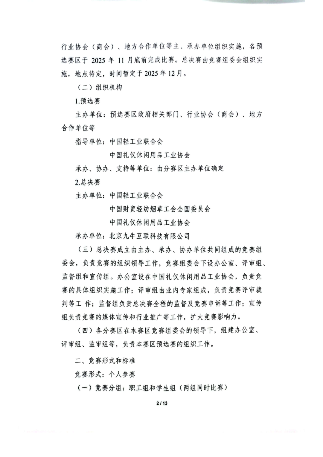 为深入学习贯彻习近平总书记在庆祝中华全国总工会成立100周年暨全国劳动模范和先进工作者表彰大会上的重要讲话精神、关于技能人才工作的系列重要指示精神,贯彻《中共中央国务院关于深化产业工人队伍建设改革的意见》,大力弘扬劳模精神、劳动精神、工匠精神,加强福利用品行业数字营销从业者的培养与选拔,激励更多劳动者走技能成才、技能报国之路,中国轻工业联合会、中国财贸轻纺烟草工会、中国礼仪休闲用品工业协会决定,将共同举办2025年全国轻工行业职业技能竞赛——首届全国福利用品数字营销职业技能竞赛(以下简称“竞赛”)。为做好竞赛各项组织实施工作,特制订本方案,现予公布。大赛相关技术工作将按照竞赛工作方案组织实施,请各参赛单位参考竞赛工作方案要求,做好各代表队的组织和技术培训工作。