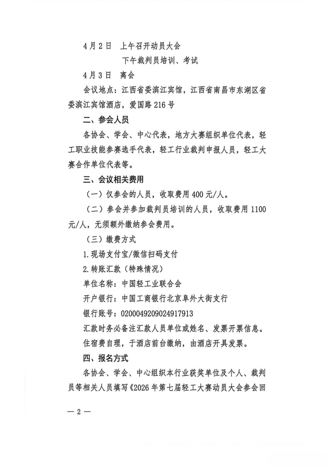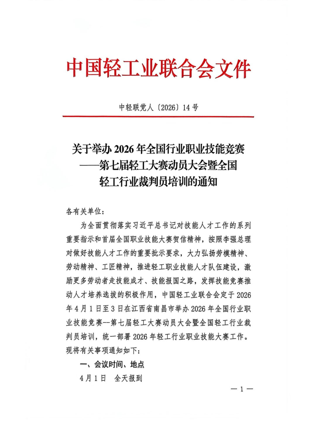 为全面贯彻落实习近平总书记对技能人才工作的系列重要指示和首届全国职业技能大赛贺信精神,按照李强总理对做好技能人才工作的重要批示要求,大力弘扬劳模精神、劳动精神、工匠精神,推进轻工职业技能人才队伍建设,激励更多劳动者走技能成才、技能报国之路,发挥技能竞赛推动人才培养选拔的积极作用,中国轻工业联合会定于2026年4月1日至3日在江西省南昌市举办2026年全国行业职业技能竞赛—第七届轻工大赛动员大会暨全国轻工行业裁判员培训,统一部署2026年轻工行业职业技能大赛工作。
